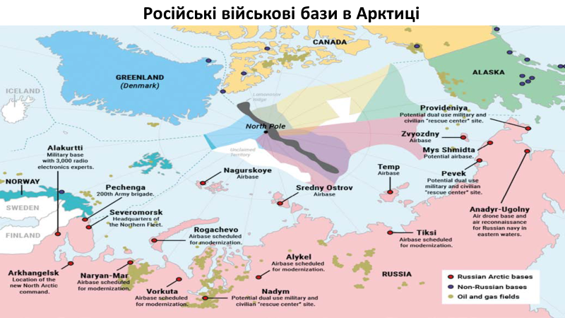 Для России идентифицирована основная угроза, возникающая в результате таяния ледового панциря в Арктике – это появление американского флота в полярных широтах, эсминцев, оснащенных системами «Aegis», которые смогут успешно перехватывать российские ракеты в направлении главного удара на США через Северный полюс. Таким образом, по заключению российских стратегов, это резко снизит угрозу для Соединенных Штатов и наоборот, повысит ее для России. Россия, как и Советский Союз, развивает военную инфраструктуру – и оборонную, и наступательную. И в этом контексте нынешние российские военные базы – это не только восстановленные прежние советские пункты базирования, базы и аэродромы для дальней авиации, но также и новые с тем, чтобы военную инфраструктуру выдвинуть дальше вглубь арктического региона.
