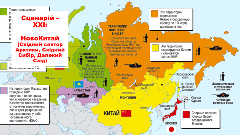 Поэтому гипотетический сценарий может выглядеть следующим образом (я условно назвал это НовоКитай) – вследствие растущих потребностей китайской промышленности, которая может быть удовлетворена только за счет доступа к новым ресурсным базам, может произойти изменение нынешней карты России в пользу Китая.